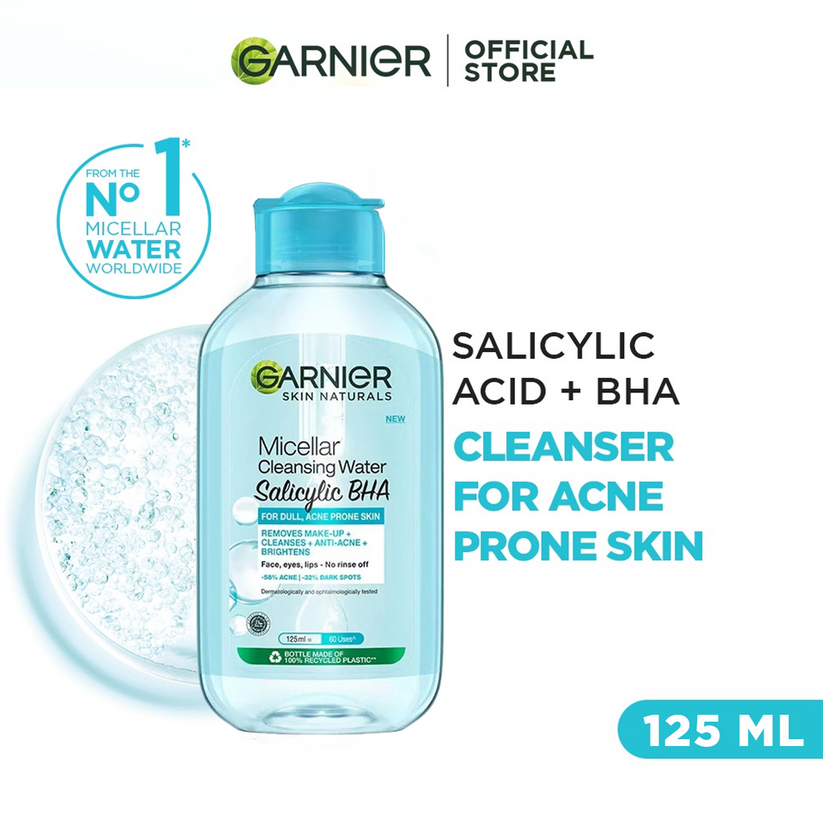 STEP 1: REMOVE MAKEUP & IMPURITIES with the Garnier Salicylic Acid, BHA Micellar Water. Saturate a cotton pad with the micellar water and gently wipe your face with it to remove all makeup and dirt.
