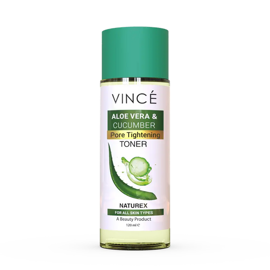 Experience the natural power of Vince NATUREX Pore Tightening Toner, expertly formulated with cucumber, hydrating Aloe Vera, and Witch Hazel to refresh and refine your skin.